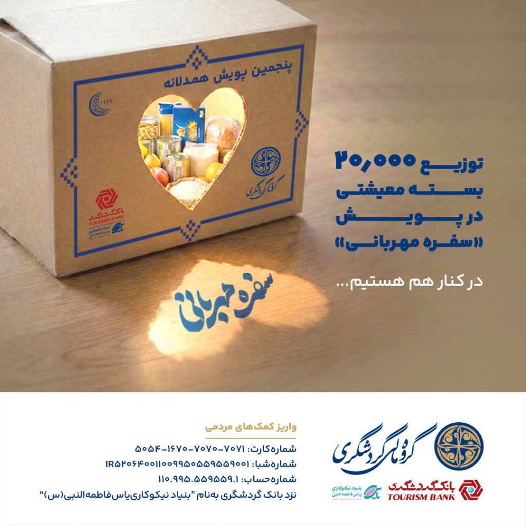 به گزارش روابط عمومی گروه مالی گردشگری، این مجموعه در روزهای پایانی سال ۱۴۰۴ با اجرای پویش «سفره مهربانی» برنامه‌ای گسترده در حوزه مسئولیت اجتماعی را در سطح کشور آغاز کرده است. در چارچوب این اقدام، ۲۰ هزار قلم کمک معیشتی شامل ۱۰ هزار بسته مواد غذایی و ۱۰ هزار کارت خرید کالا برای حمایت از خانواده‌های کمتر برخوردار پیش‌بینی شده و فرآیند توزیع آن در ۶۰ نقطه کشور و ۴۰ نقطه از شهر تهران در حال انجام است.